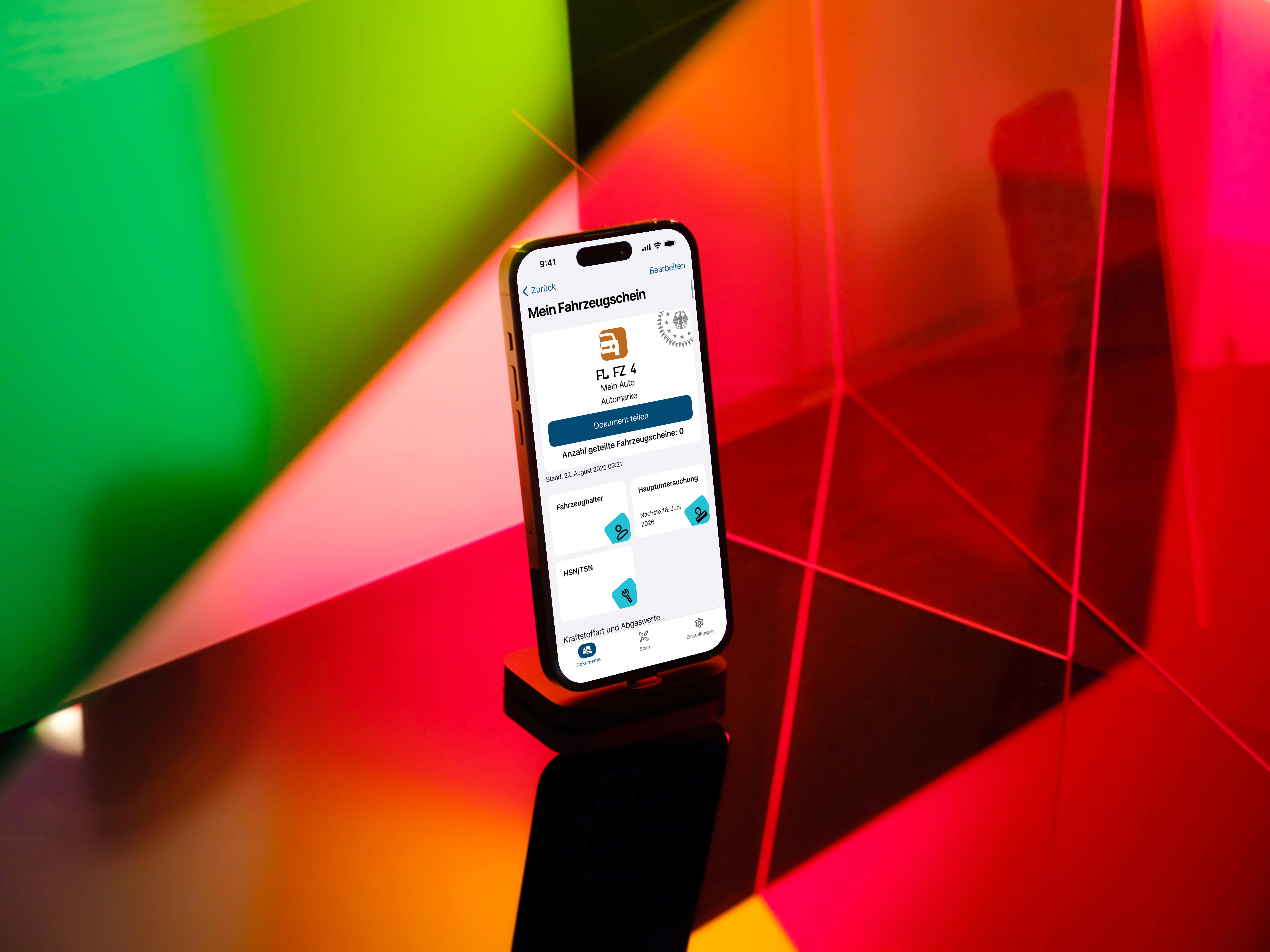 Die Nutzenden können ihre Fahrzeugscheine mithilfe der eID-Funktion in die App laden und diesen dann konfigurieren. Sie können Icon, Farbe und Name anpassen, um den Fahrzeugschein nach ihren Wünschen zu individualisieren. Nach dem Hinzufügen eines Fahrzeugscheins finden Nutzende in übersichtlichen Kategorien die gewünschten Informationen über ihre Fahrzeuge. Natürlich ist es auch möglich, den Fahrzeugschein digital zu teilen, um einer anderen Person das Fahren mit dem eigenen Fahrzeug zu ermöglichen. Dies geht ganz einfach über einen QR-Code oder einen Link, der im Anschluss an die Person, welche das Fahrzeug fahren möchte, verschickt werden kann.